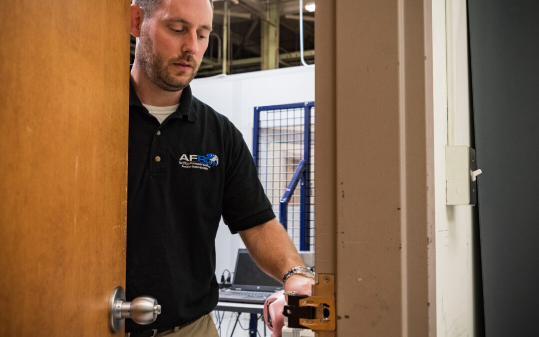 190818-F-HX758-1013 by AFRL PA | Sep 30, 2019 demonstrates how to use one of the portable door locks, Research, Safety, innovation
