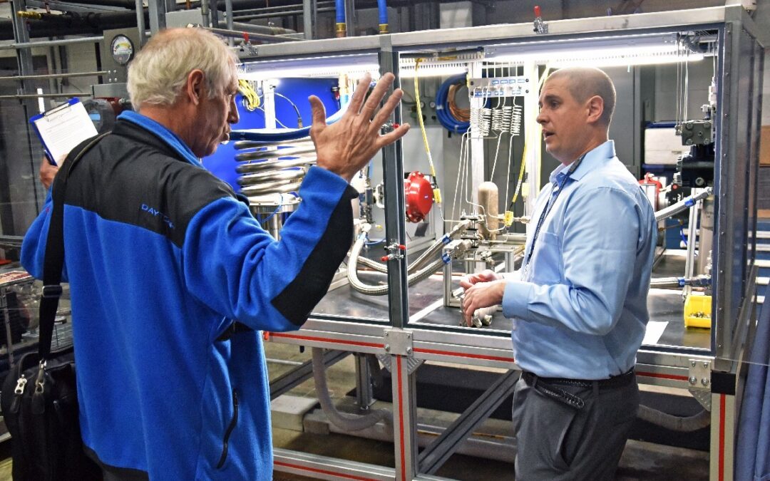 Marvin Gale, MAMLS Program Manager (left) and Grady Marcum, AFRL chemical engineer, discuss the new heat exchange tester during the capability’s kick-off tour, held Nov. 6. (U.S. Air Force Photo/Spencer Deer)