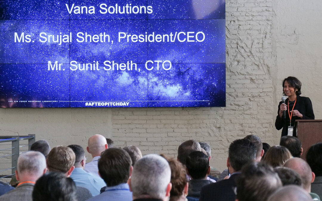 Srujal Sheth, President and CEO, and Sunit Sheth, Chief Technology Officer, of Vana Solutions, a woman-owned small business from Beavercreek, Ohio, discussed the success their company has experienced working with the AF SBIR/STTR program during a small business showcase presentation at the beginning of the first Air Force Technology Executive Officer Pitch Day Nov. 15. (U.S. Air Force photo/Keith Lewis)