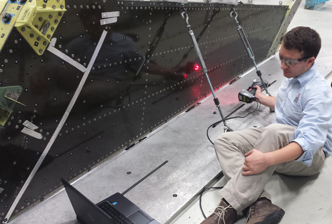 Solomon Duning, Research Engineer from The University of Dayton Research Institute, uses laser scanning technology to inspect an F-16 vertical tail on a depot fixture. (Courtesy photo)