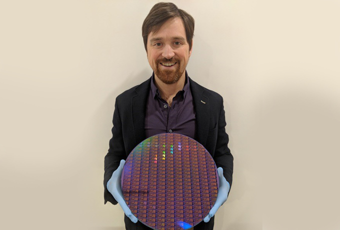 Dr. Chad Husko, CEO and founder of Iris Light, holds a 300 mm silicon wafer. (Courtesy photo)
