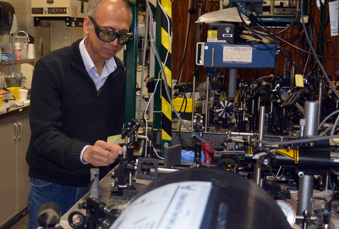 An electro-optics survivability team of Air Force Research Laboratory personnel earned a 2021 U.S.- UK Science & Technology Stocktake Team Achievement Award for their work and experimentation with lasers. Seen here in a laser lab, team member, Dr. Shekhar Guha, a senior scientist in AFRL’s Materials and Manufacturing Directorate, adjusts an optic behind a carbon dioxide laser. (U.S. Air Force photo/Donna Lindner)