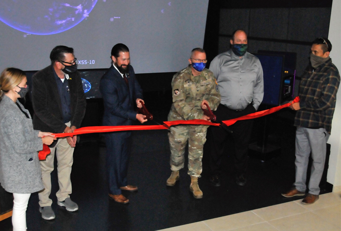 Col. Eric Felt, director of the Air Force Research Laboratory Space Vehicles Directorate and Dr. Darren Raspa, AFRL Phillips Research Site historian, cut the ribbon to open the directorate’s Legacy Portal Mission Control exhibit, at a ceremony held Nov. 15, 2021 at Kirtland AFB, N.M. Supporting them left to right: Gina Gutierrez, project manager; Bradley Rieck, senior facility engineer; Dan Von Tom, chief of the Corporate Information Office; and Victor Mace, project coordinator. (U.S. Air Force photo/Arturo Cardona)