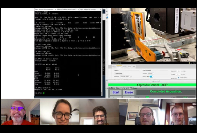 During COVID-19 restrictions, the research team established protocols and routines that allow remote sample manipulation and data acquisition. From left to right: Dr. Hilmar Koerner, Cornell staff scientists Drs. Louisa Smieska and Arthur Woll, and AFRL Materials and Manufacturing research scientists Dr. Edward Trigg and Mr. Andrew Abbott. The black command window with code lines (upper left) shows the UNIX-based software package for instrument control and data collection SPEC. Users can run their own software packages written in the programming language python to position the sample stage and to program automated sample movement. The camera image (AXIS) in upper right shows a close-up of the sample stage in the beamline hutch. While beamline staff mount the samples, everything else is being done remotely from the comfort of either office or home. (Courtesy photo)