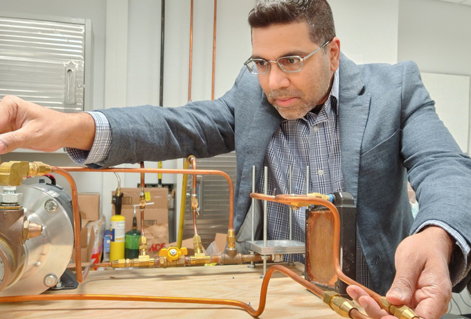 Using a laser diode system on loan from the Air Force Research Laboratory, New Mexico State University associate professor Dr. Krishna Kota tests the seal integrity of the cooling flow loop located in the Surface-environment Interaction Research Laboratory, or SIRE Lab, at NMSU. The flow loop will be used to test the ability of novel two-phase cooling approaches in handling the highly challenging, transient heat densities of directed energy weapon systems. (Courtesy photo)