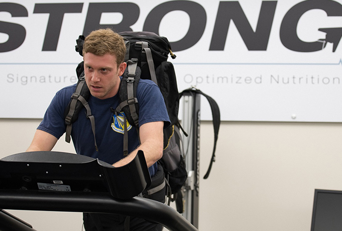 Kevin Schmidt, research engineering psychologist in the Air Force Research Laboratory and Defense Department Science, Mathematics and Research for Transformation (SMART) scholar at Northwestern University, walks on the treadmill with a 70-pound pack to demonstrate one of the ways he has been training for his climb of Mount Aconcagua in South America. He and his team seek to identify new ways to prepare warfighters for deployments in high altitude environments. (U.S. Air Force photo by Richard Eldridge/released)