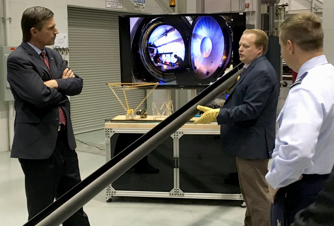Dr. Andy Williams, center, Air Force Research Laboratory Deputy Technology Executive Officer for Space Science & Technology, explains the engineering of the Roll-Out-Solar Array, or ROSA, to U.S. Senator Martin Heinrich during a past visit to AFRL’s Space Vehicles Directorate at Kirtland Air Force Base, New Mexico. (Courtesy photo)