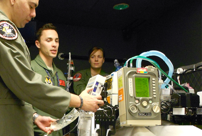 Air Force Cardiopulmonary Lab staff and CSTARS Cadre from the United States Air Force School of Aerospace Medicine (USAFSAM), at Wright-Patterson Air Force Base, including Chief Master Sgt. James Woods (forefront), Master Sgt. Jensen DeNijs (middle), and Master Sgt. Erin Seley (background) are shown evaluating a patient simulation scenario which incorporates the use of the 731 EMV+ ventilator used in their trial at the University of Cincinnati Medical Center C-STARS (Center for Sustainment of Trauma and Readiness Skills) in this July 2016 photo. C-STARS is a joint program between the University of Cincinnati Medical Center and the Air Force, offering training for military medical personnel in the areas of trauma and critical care. (U.S. Air Force photo/Dario Rodriquez)