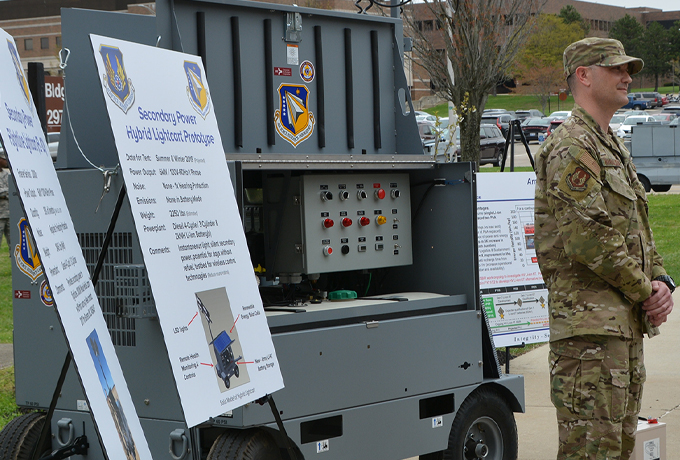 An outdoor operational demonstration comparing legacy versus new prototype flight line equipment included a 60 kilowatt JP-8 turbine flight line generator, 72 kilowatt two-cycle diesel flight line generator, a hybrid flight line generator prototype (battery/diesel) and hybrid light cart prototype (battery/solar cell/diesel).