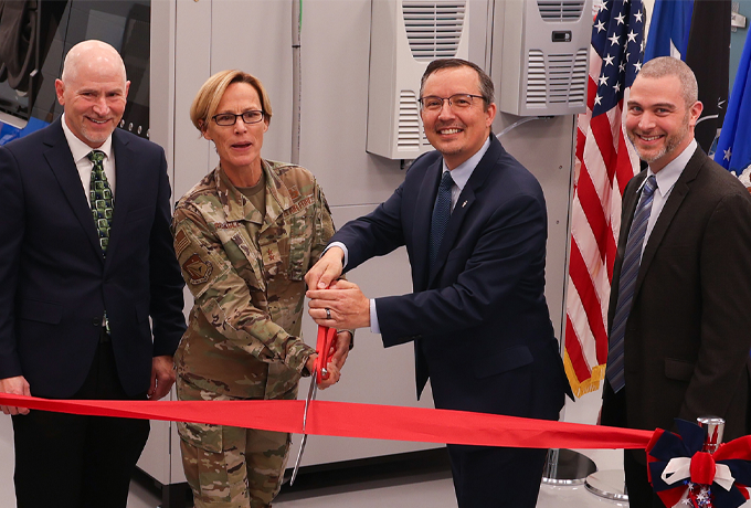 Air Force Research Laboratory Commander Maj. Gen. Heather Pringle and AFRL Materials and Manufacturing Director Darrell Phillipson cut a ribbon during a ceremony celebrating the reopening of the Additive Manufacturing Laboratory at Wright-Patterson Air Force Base, Ohio, Nov. 9, 2022. Technical Lead John Brausch and Research Materials Engineer Dr. Edwin Schwalbach, far right, oversaw extensive facility renovations and the addition of state-of-the-art equipment. (U.S. Air Force photo / Jonathan Taulbee)