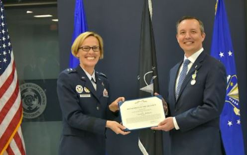 AFRL Commander Gen. Heather Pringle presents Mr. Darrell Phillipson with the Meritorious Civilian Service Award.
