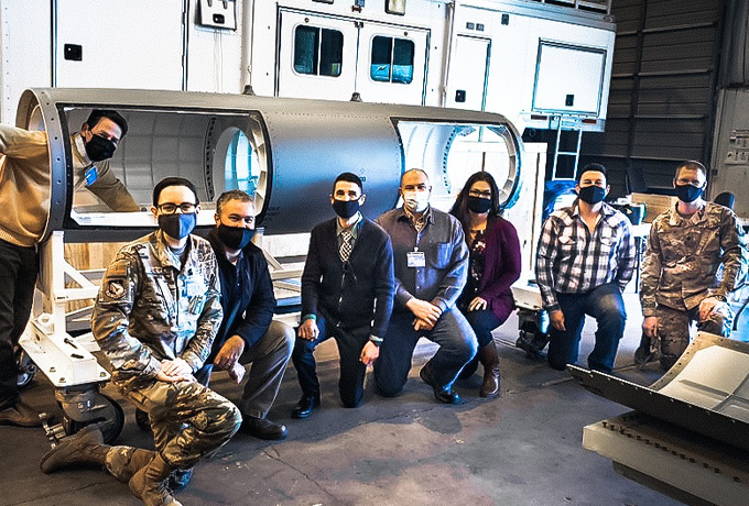 Members of the SHiELD program and their Boeing contractor team inspect the newly arrived SHiELD pod, which will be equipped with additional assembly pieces later this spring. (Photo: courtesy Boeing)