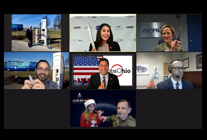 “AFWERX Accelerate was a big week with Agility Prime having a ground-breaking ceremony for a simulation facility to allow experimentation from the researcher to the operator in the field,” said Gen. Arnold W. Bunch Jr., Commander of Air Force Materiel Command. The ground-breaking, as well as a “ribbon cutting ceremony” for an electric aircraft charging station, occurred at Ohio’s Springfield-Beckley Municipal Airport. However both events were virtual given the worsening COVID-19 situation. Top left – Warren Copeland, Mayor of Springfield, Ohio; Top Center – Elaine Bryant, Executive Vice President for Aerospace and Defense, Dayton Development Coalition; Top Right – Brig. Gen. Heather Pringle, AFRL Commander; Middle left – Chip Palomino, BETA Technologies team member; Middle Center – J.P. Nauseef, JobsOhio President and CEO; Middle Right – Paul Waugh, PEO Mobility and Training Aircraft, Air Force Life Cycle Management Center; Bottom – Col. Nathan Diller, AFWERX Director, and his daughter Catherine (Screen image courtesy of AFWERX)