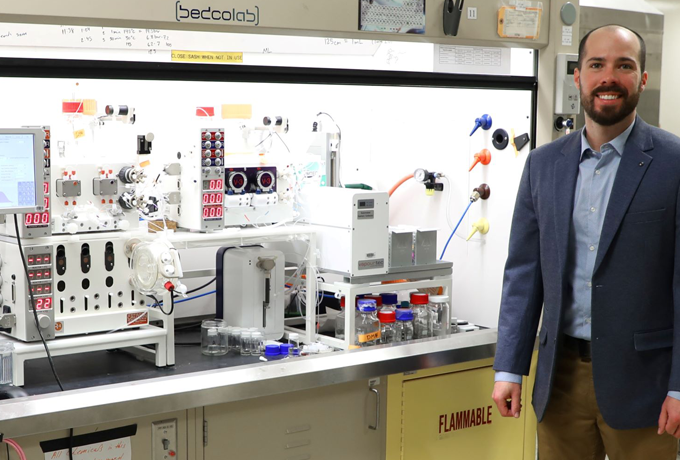 Dr. Luke Baldwin with Flow Chemistry machine. (U.S. Air Force photo/Jonathan Taulbee)