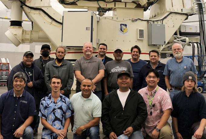 The Boeing team poses with the Advanced Electro-Optical System, or AEOS, primary mirror following a recoat at the Air Force Maui Optical and Supercomputing (AMOS) site, Maui, Hawaii. This was the second recoat of the mirror since AEOS’s initial installation in 1997. AMOS is part of the Air Force Research Laboratory, and the 3.6-meter AEOS telescope supports the U.S. Space Force’s space domain awareness mission. (Courtesy photo / Boeing)