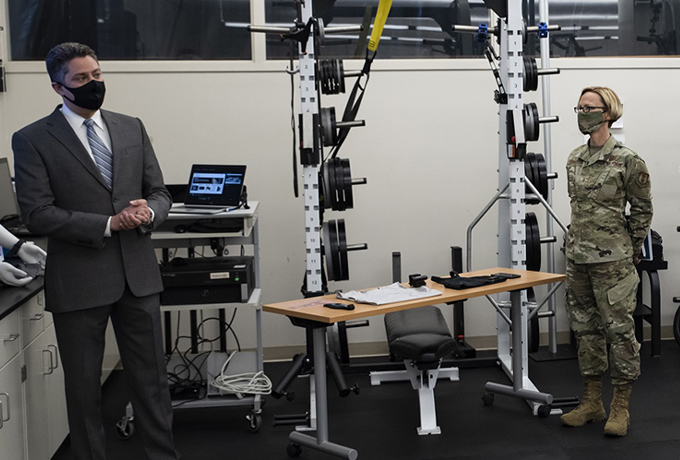 Researchers in the 711 HPW also test wearables in the centrifuge, which Allvin next observed on the tour. The massive centrifuge device teaches aeromedical students about the effects of gravity forces on human physiology and gives USAF fast-jet aviators the capability to experience up to nine Gs, or nine times the normal force of gravity, in a controlled environment to measure a pilot’s ability to counteract the effects and prevent G-induced loss of consciousness. In addition, Allvin toured 711 HPW’s research altitude chambers.