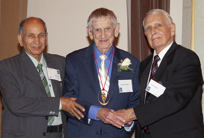 Dr. Som Soni, left, former Air Force Research Laboratory scientist Dr. Nicholas “Nick” J. Pagano, center, and Engineering and Science Hall of Fame Board of Trustees President James Mattice, right, pose in the Engineers Club in Dayton, Ohio, Nov. 9, 2022, following Pagano’s induction ceremony. Soni, Pagano’s longtime friend and colleague, wrote the nomination package to highlight Pagano’s extensive achievements and contributions to the composite materials research field over 40 years. (Courtesy photo)
