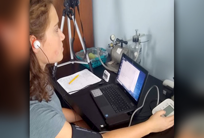 A student intern teleworking on a project involving acceleration and altitude research for her mentor at the 711th Human Performance Wing. (Courtesy photo)